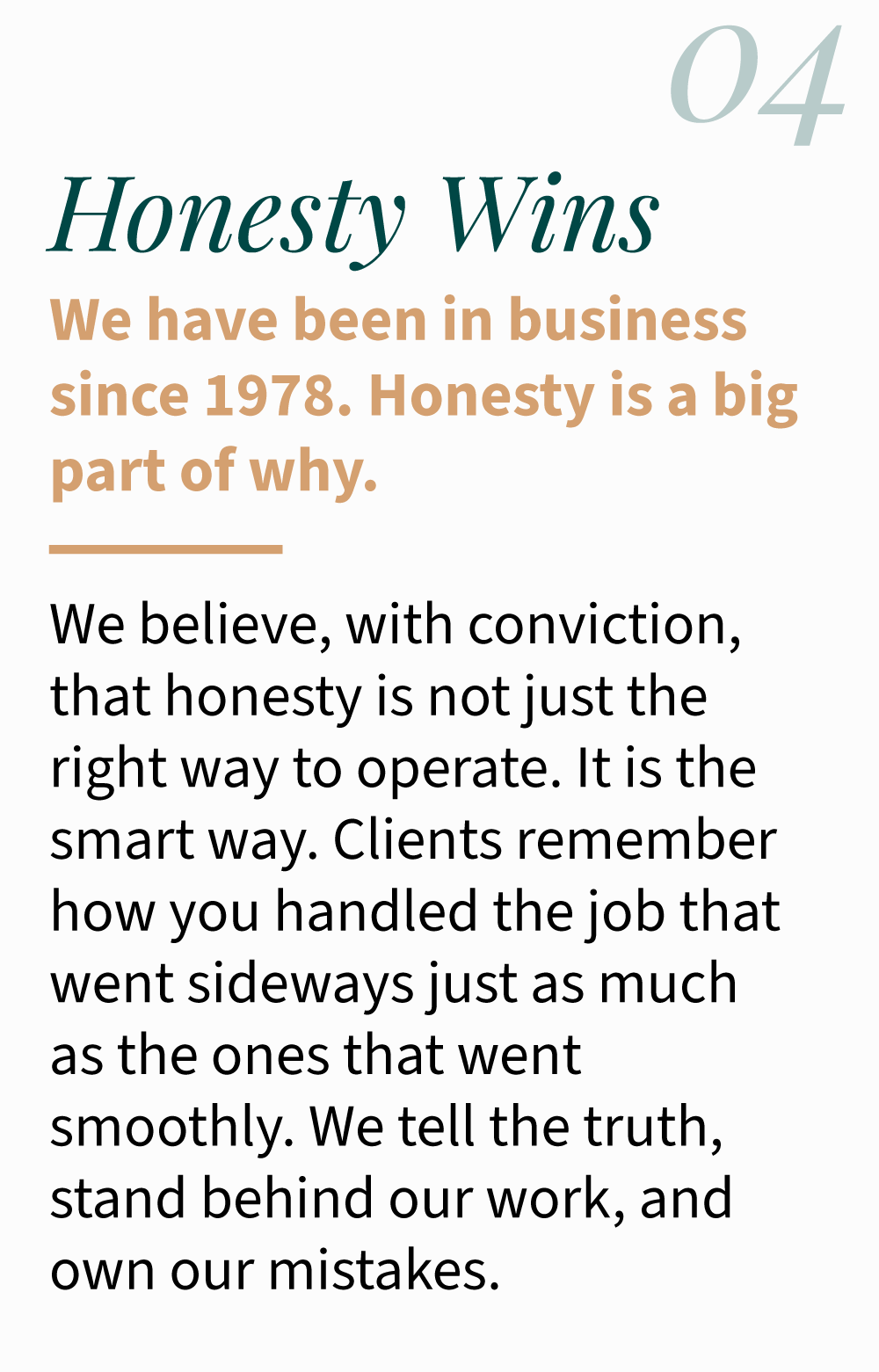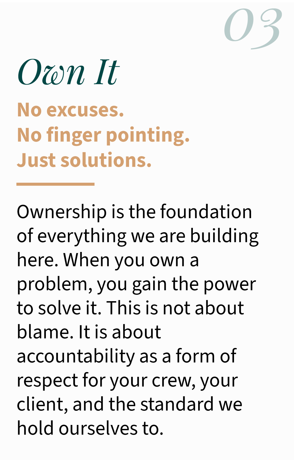 We want to be the kind of company where leadership doesn't start with a title. Where taking ownership, communicating clearly, and helping the people around you be their best are not policies, but habits. Where every crew member, on every job, feels like the work they do matters and the place they work cares about them.